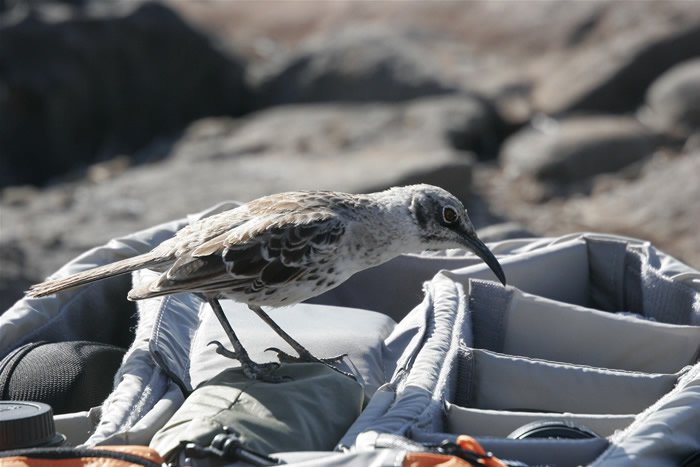 This island also had many mockingbirds. The mockingbirds on the Galapagos islands are fresh-water obsessed, and chase after tourists for fresh water (they know we bring bottled water!). They flocked to my pack, but also to where they thought water might be, “stalking” other people’s backpacks.