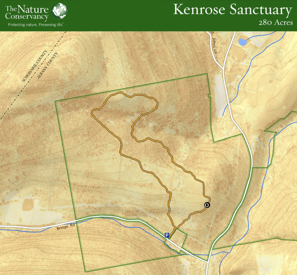 Kenrose Preserve, with its 1.5-mile trail, offers a case study in the reversion of cultivated farmland back to natural forest. The land at this site, which was at the western boundary of Van Rensselaer Manor, was settled in the 18th century. Farms in this area raised grains, potatoes, hops and hay for horses that worked on the Erie Canal. While many neighboring farms were abandoned early in the 1900s, some cultivation continued at Kenrose into the 1950s.