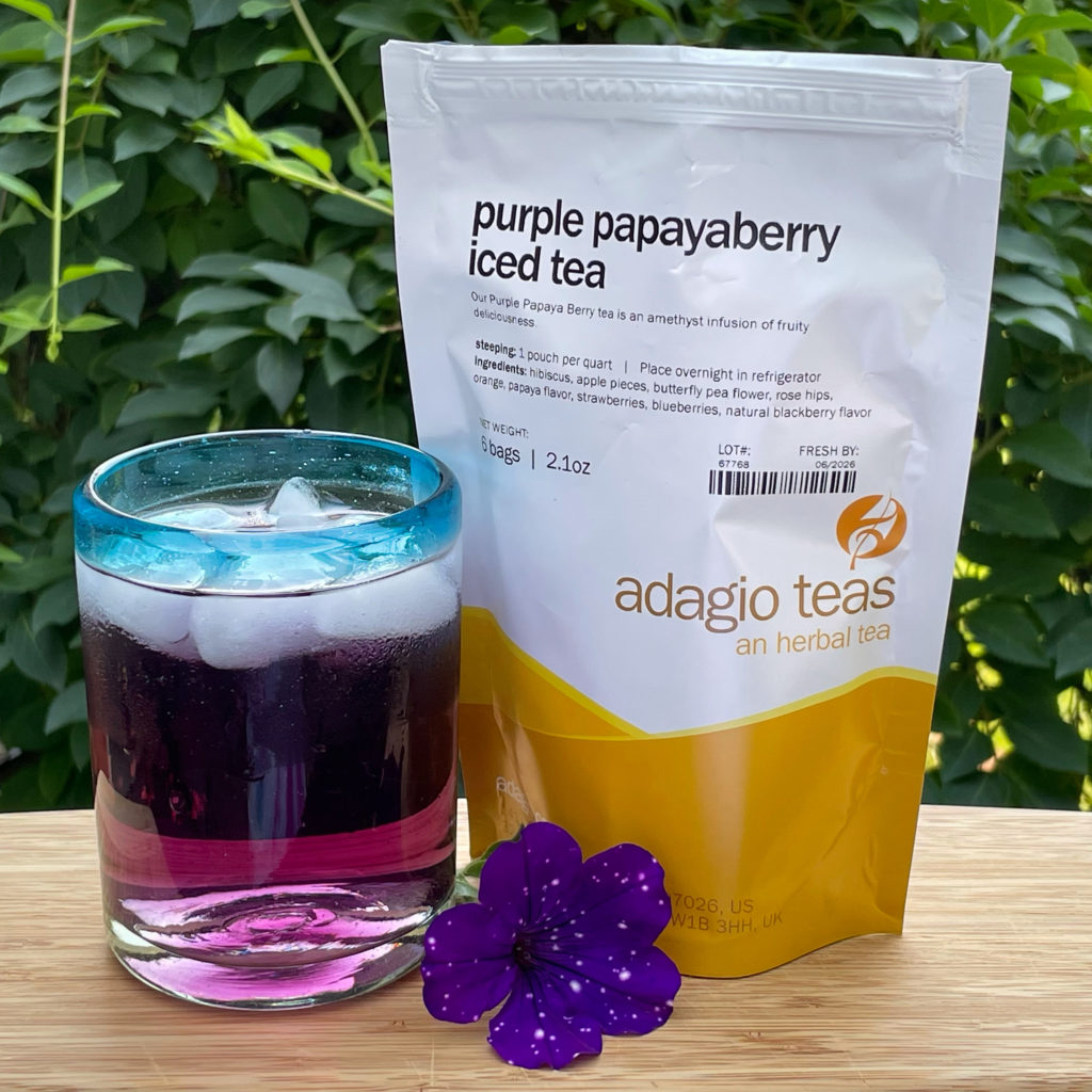 Adagio Teas offers other teas that contain butterfly pea flower, like this purple papayaberry iced tea. I love how easy this is to make, with large tea bags that can be placed in a quart of water overnight to steep.