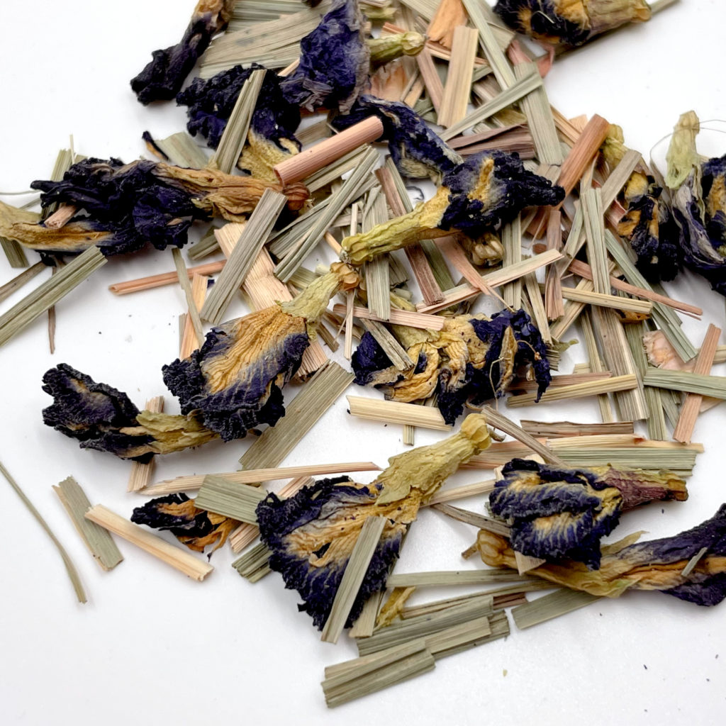 Bella Luna Blue is a blended blue tea, and contains Butterfly Pea Flower, Lemon Grass & Natural Blueberry Flavor.