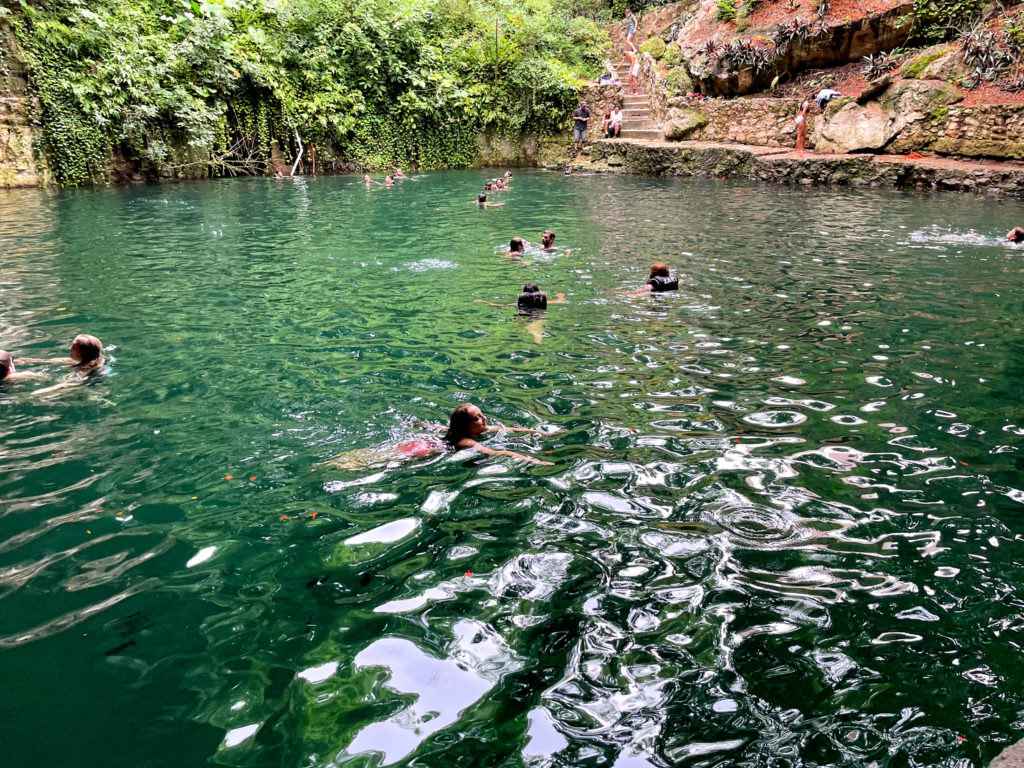 Most people were near the bottom of the stairs and swimming in the shallower parts of the cenote.