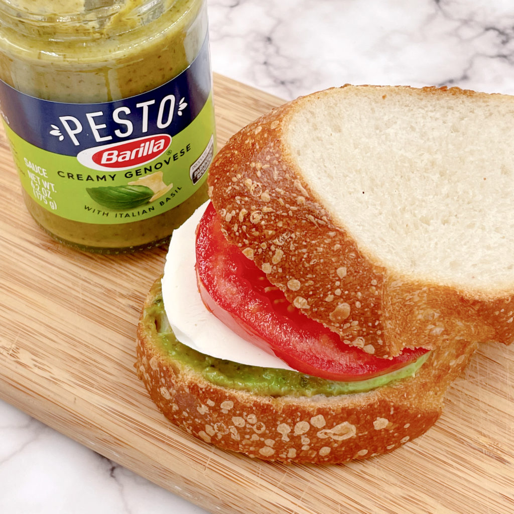 After a long day at work, this sandwich takes only a few minutes to prepare, using just tomato, fresh mozzarella cheese, and Barilla Creamy Genovese Pesto. You can eat this sandwich fresh, or make it as a panini.