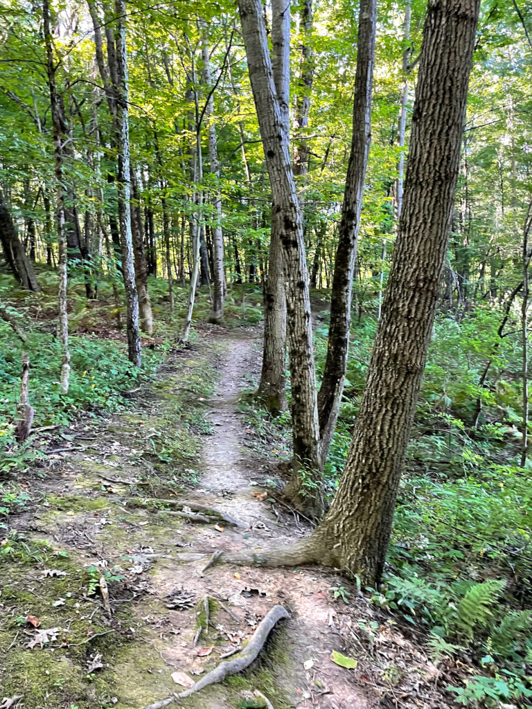 The trail is fairly flat, with a few steep sections. There are also some roots sticking out along the trails.