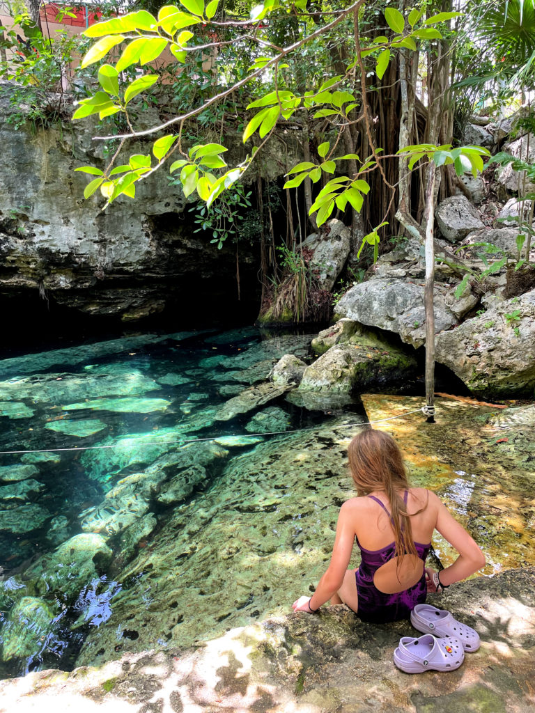 We always bring water shoes with us to Mexico. This is good for the beach, and also if you go off the resort and visit cenotes. This photo is from our trip to Cenote Cristalino nearby.