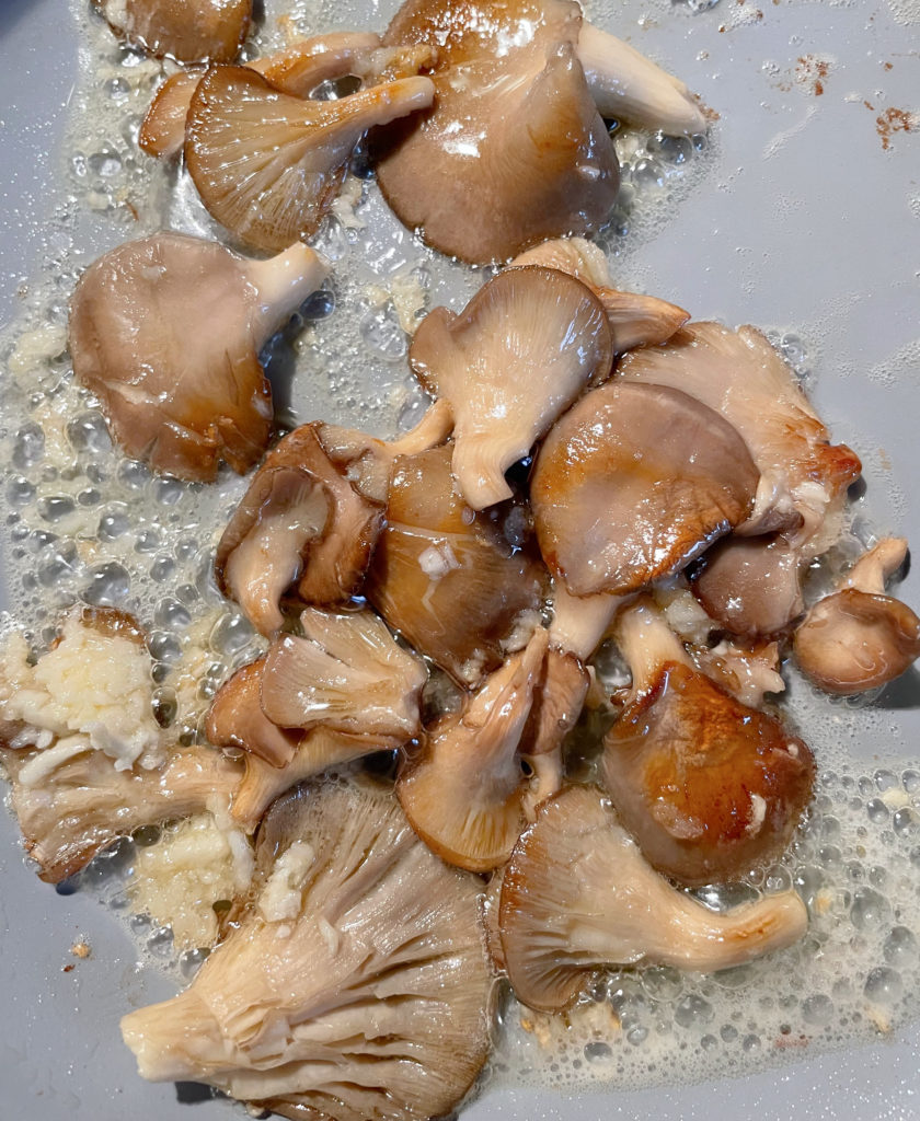 I used fresh oyster mushrooms that I grew at home with my Back to the Roots Oyster Mushroom Kit. This type of mushroom has a low moisture content. If you use mushrooms like white button mushrooms, they will let out moisture, so certain types of mushrooms really need to be cooked down for longer.