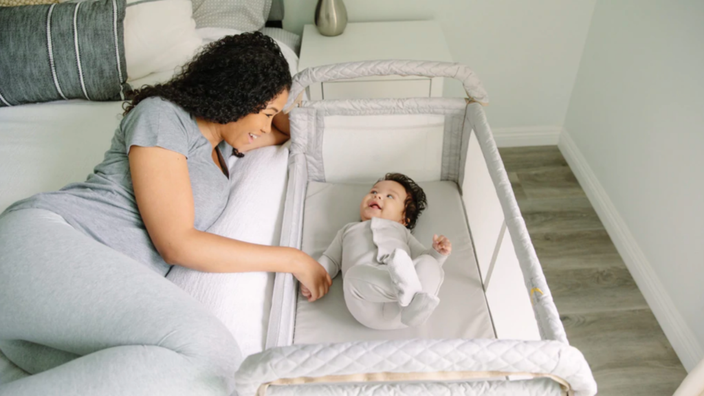 A great product is the Arm’s Reach Co-sleeper which provides a way to safely and securely attach a bassinet to the parents’ bed. This promotes good and safe sleep for baby. This bedside co-sleeper bassinet allows parents and baby to have their own sleeping space yet enables mom to be within arm’s reach of her baby for easier nighttime nursing and comforting. The high walls on three sides protect baby and the lowered rail is a similar height to the adult mattress, which facilitates easy access to baby. This year, Arm’s Reach is celebrating its 25th anniversary… testament to its effectiveness, popularity with parents, and perfect safety record.