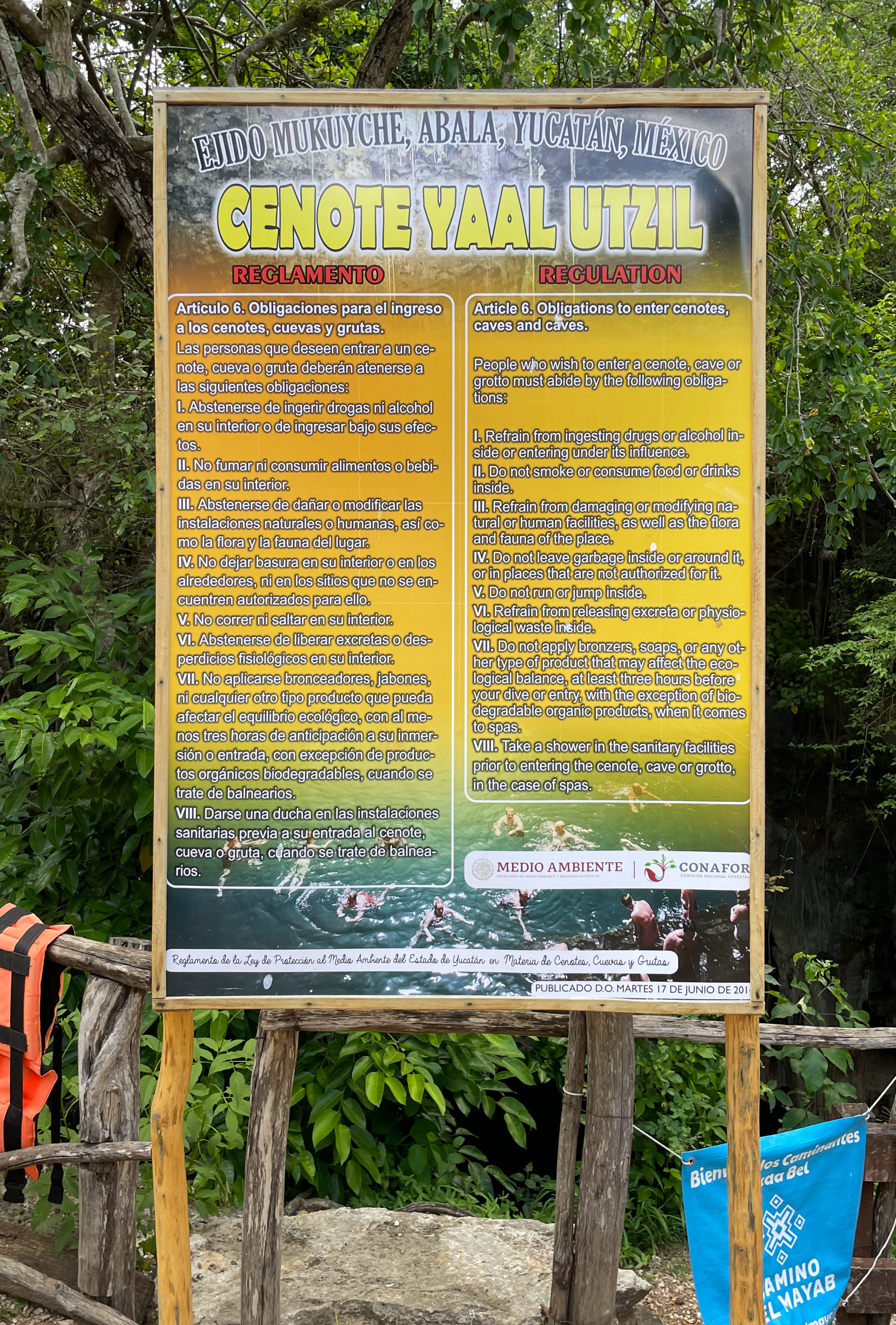 Like other cenotes, the rules say not to wear sunscreen, bug spray, or other things on your skin before entering the cenote. This helps to preserve the water quality.