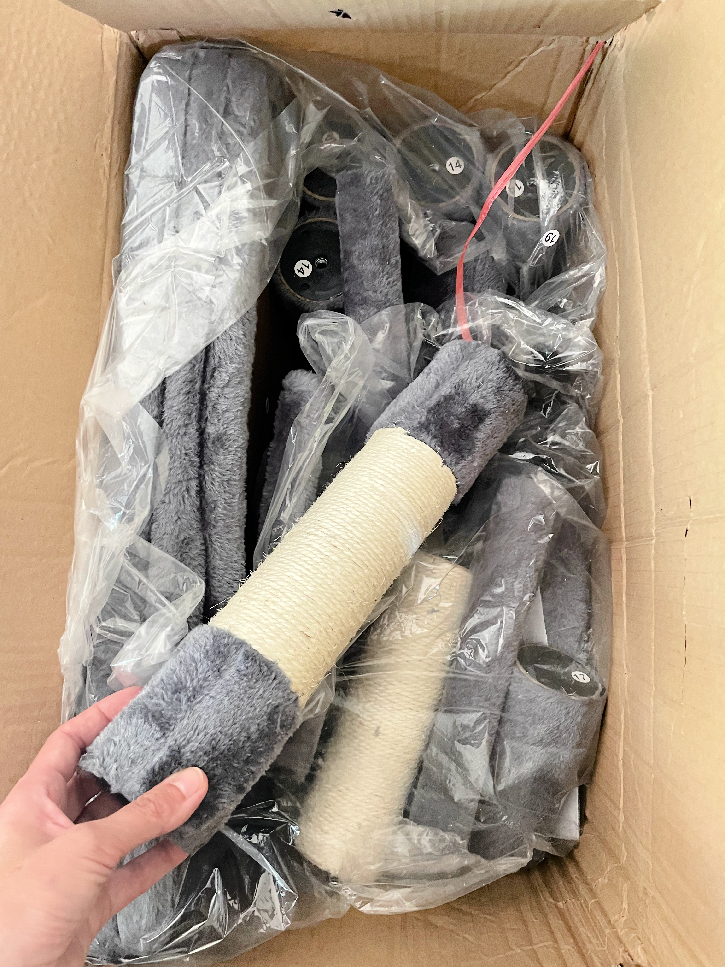 Putting the cat tree together is very easy. There is an instruction booklet, and the only tool you need is an allen wrench that is provided. My 15 year old daughter put this together on her own without any problems – except for the fact that the cats were absolutely captivated by the unassembled parts and were very involved!