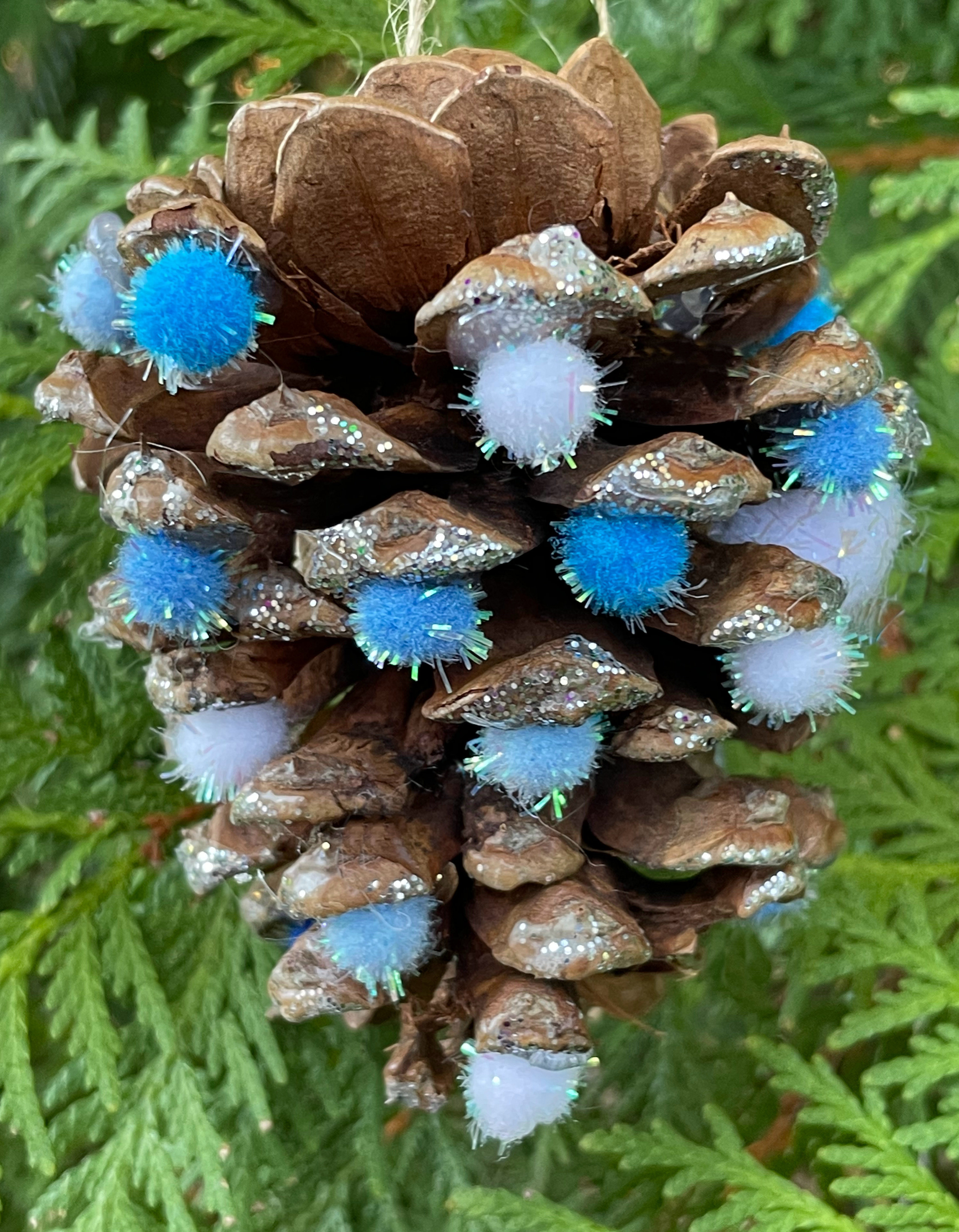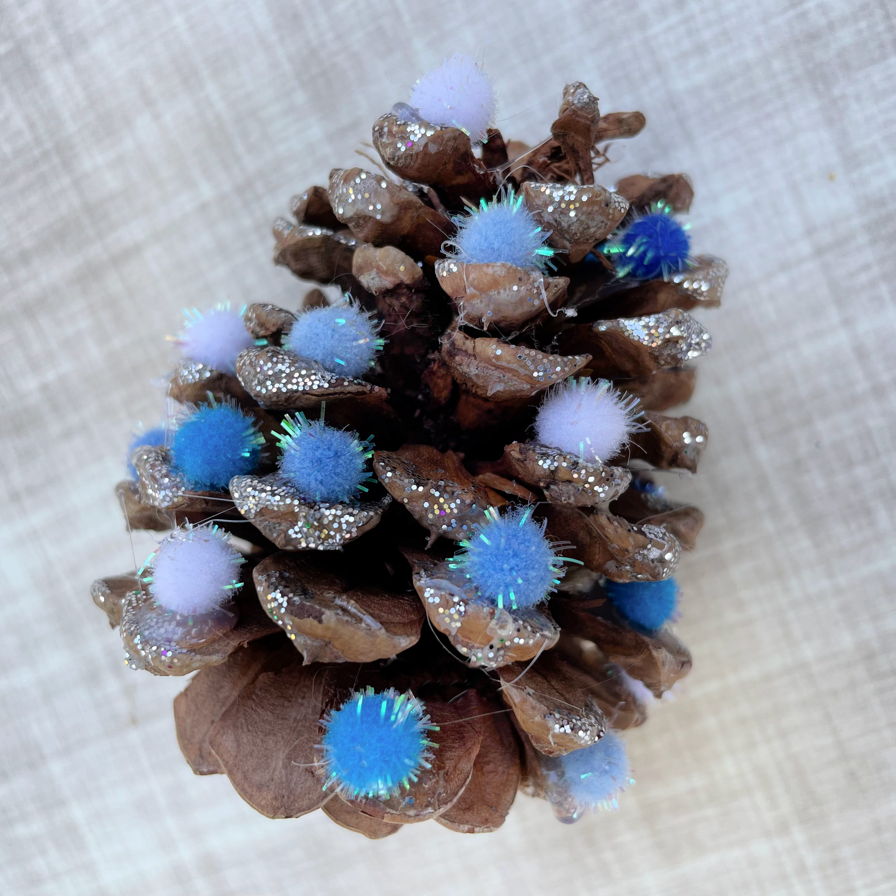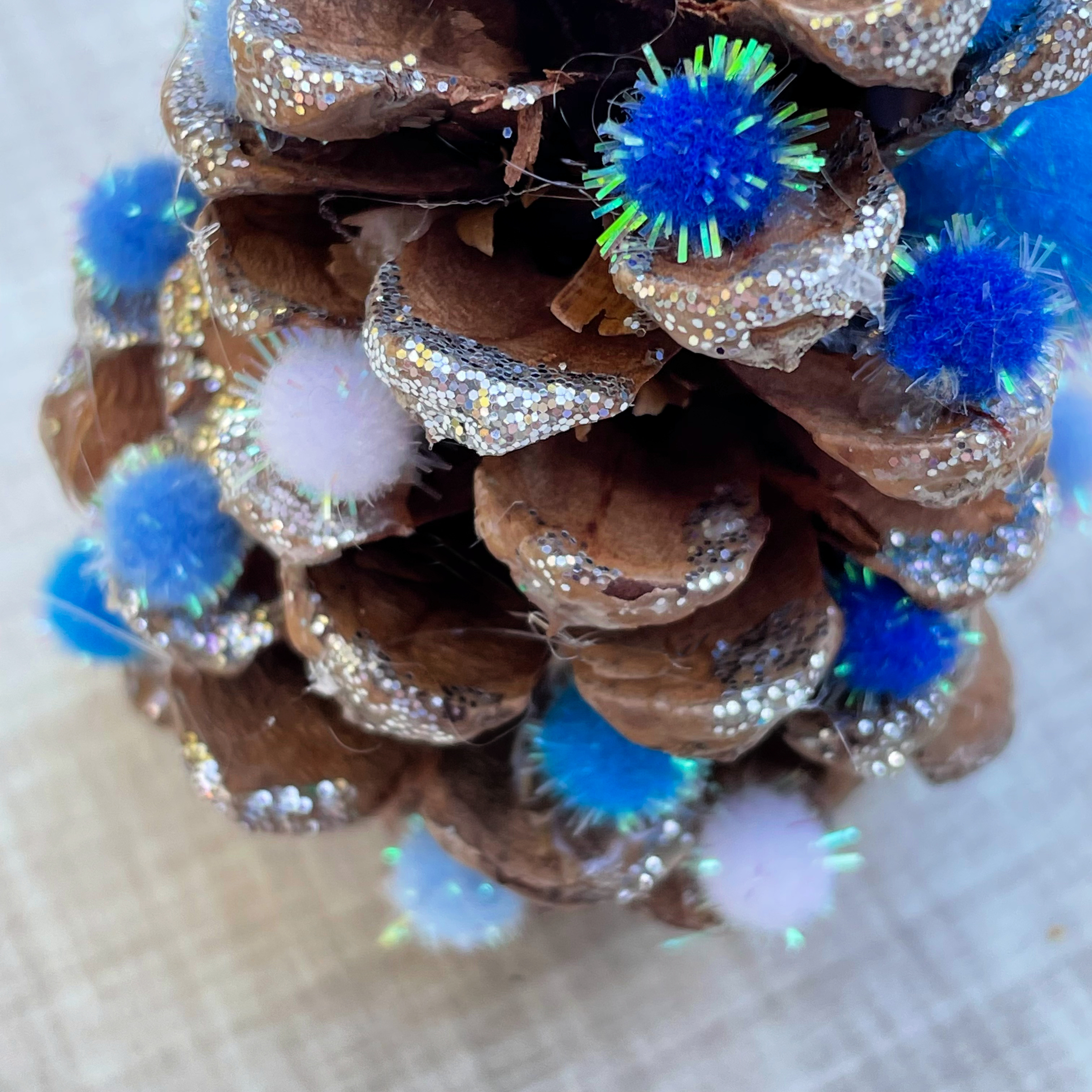 If you want to make your pinecone glittery, brush some white glue on to the pinecone and sprinkle glitter on.